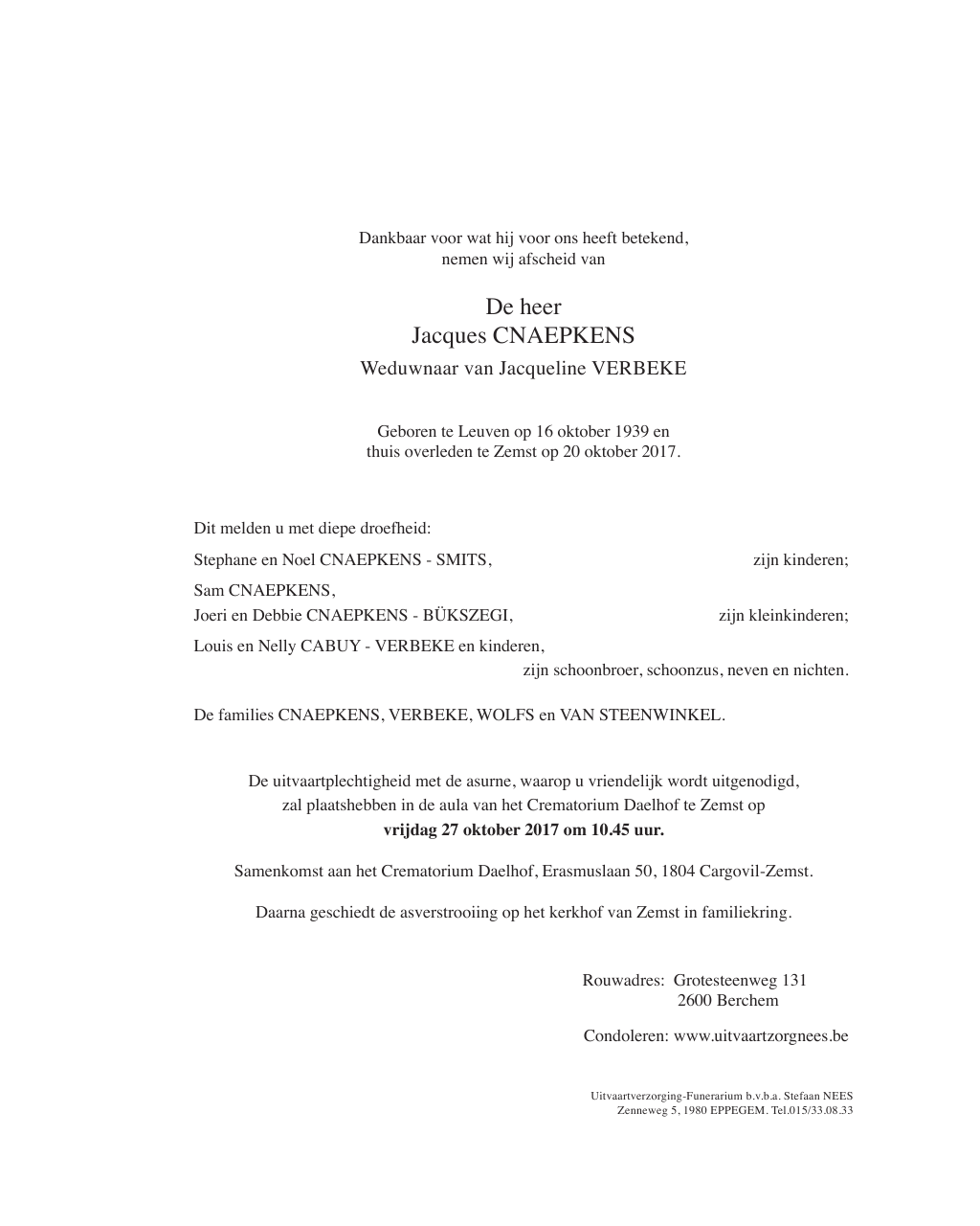 Overleden te Zemst (1980) op vrijdag 20 oktober 2017 op 78-jarige leeftijd