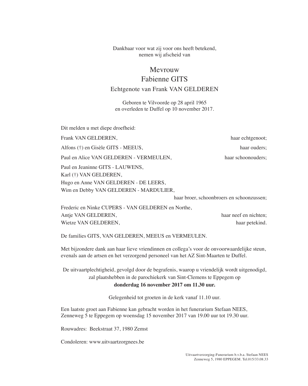 Overleden te Duffel (2570) op vrijdag 10 november 2017 op 52-jarige leeftijd