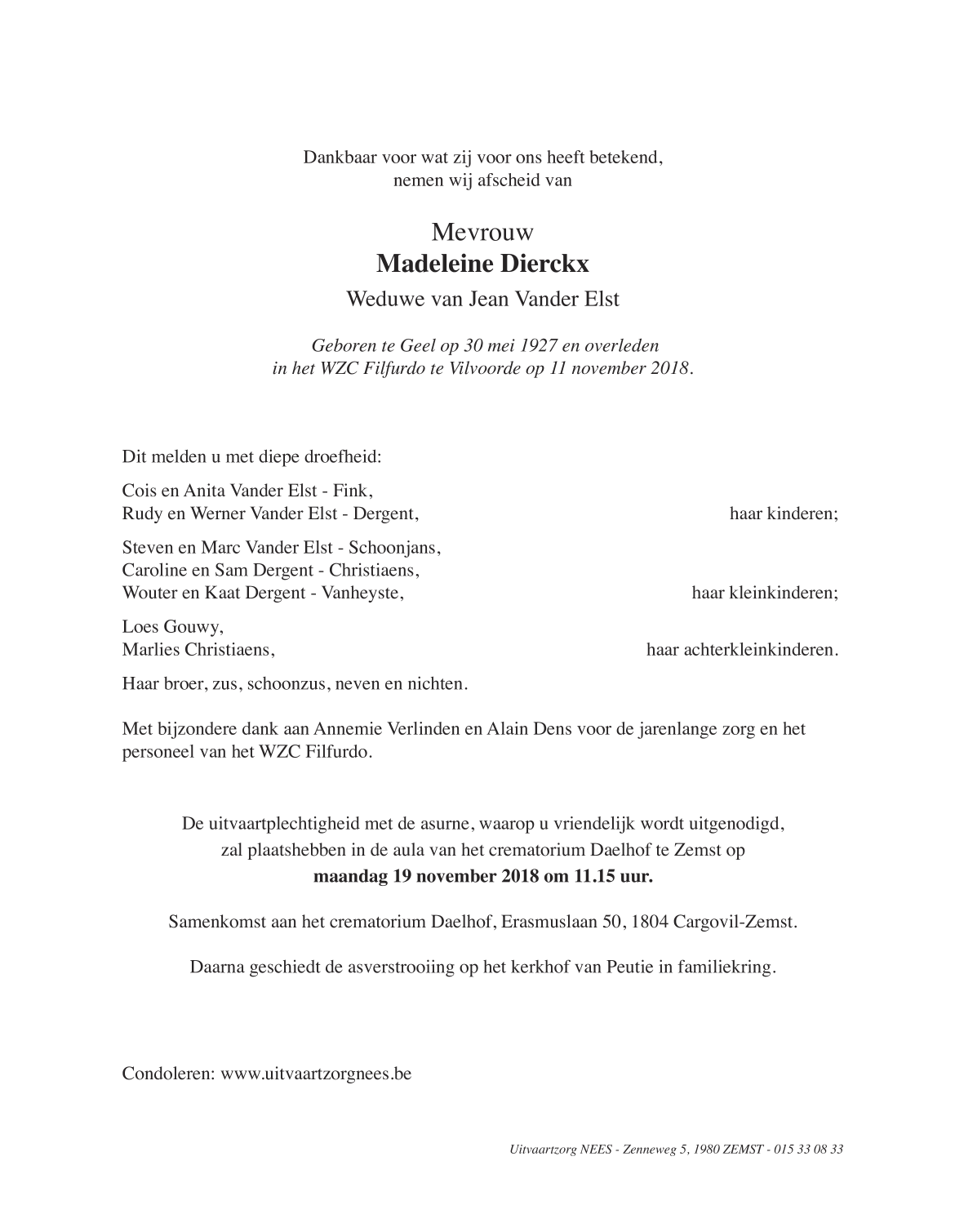 Overleden te Vilvoorde (1800) op zondag 11 november 2018 op 91-jarige leeftijd