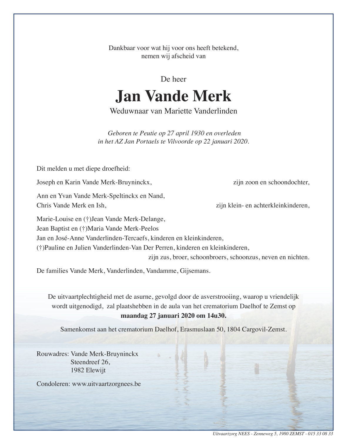 Overleden te Vilvoorde (1800) op woensdag 22 januari 2020 op 89-jarige leeftijd