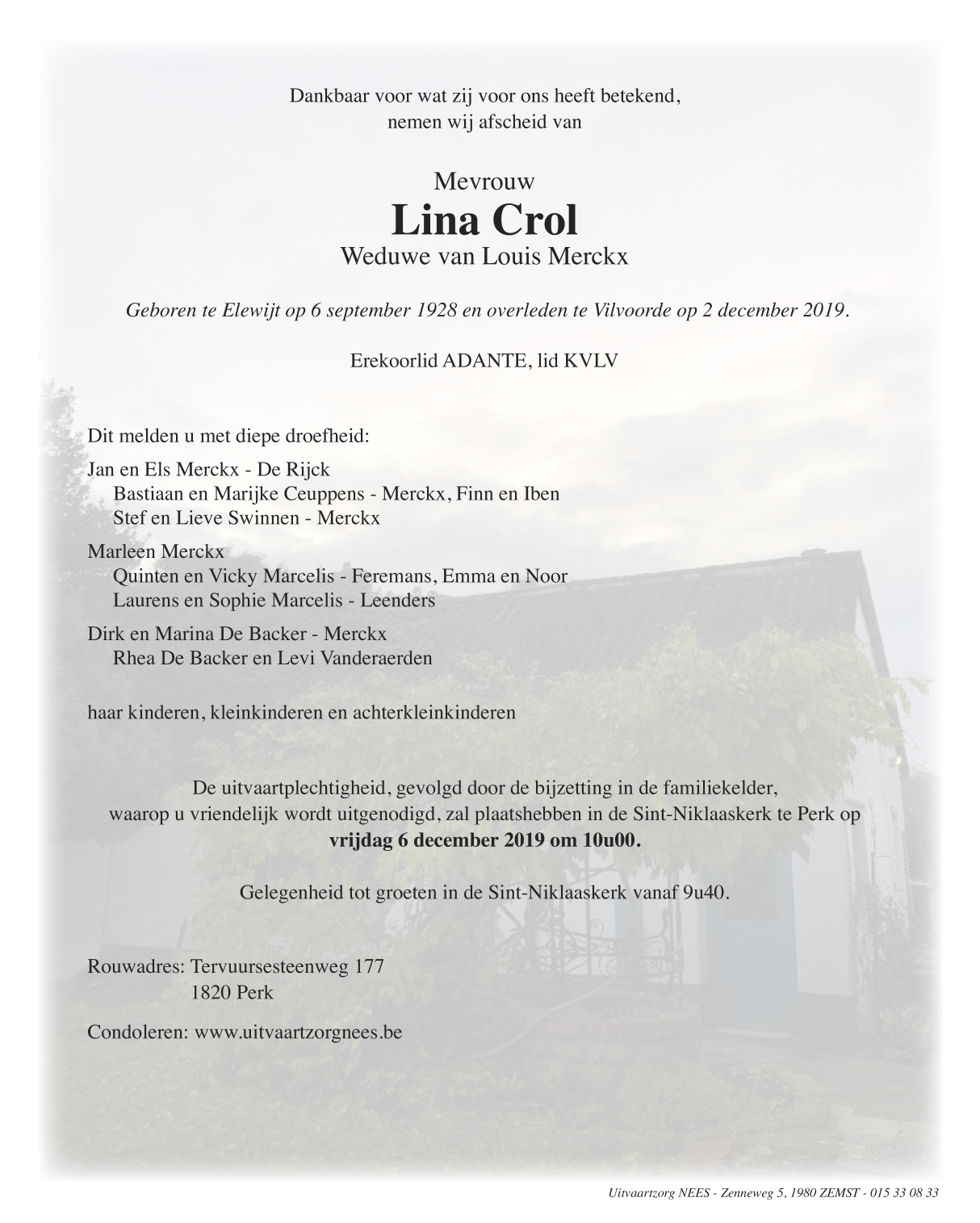 Overleden te Vilvoorde (1800) op maandag 2 december 2019 op 91-jarige leeftijd