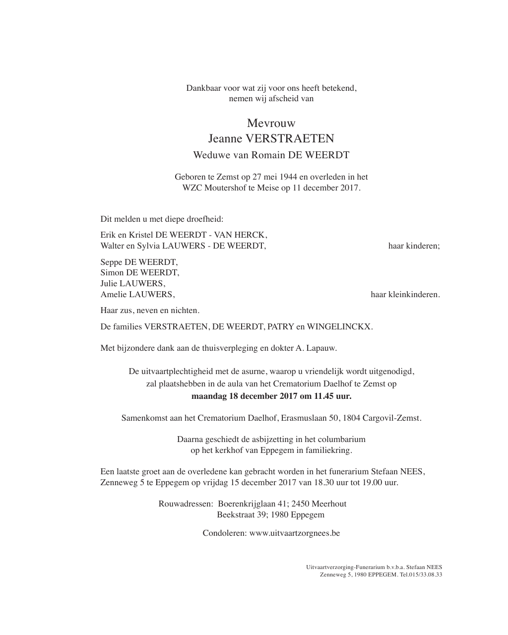 Overleden te Wolvertem (1861) op maandag 11 december 2017 op 73-jarige leeftijd