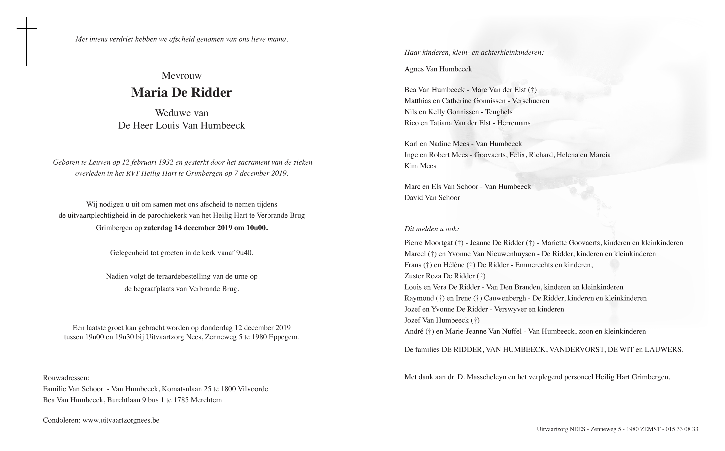 Overleden te Grimbergen (1850) op zaterdag 7 december 2019 op 87-jarige leeftijd